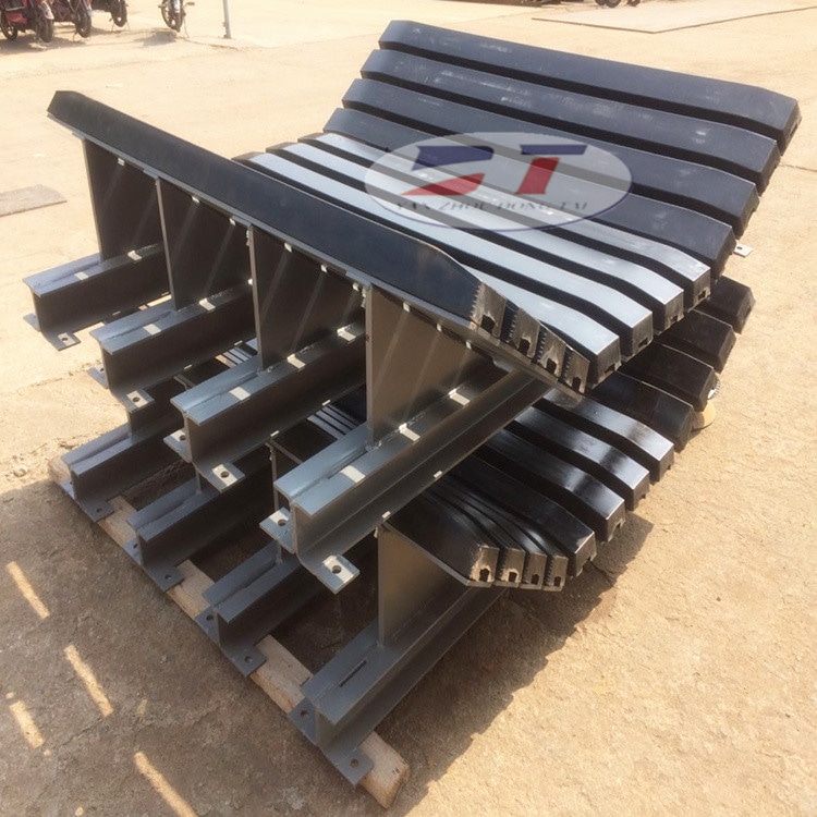 4、緩沖條的表面材料為UHMW-PE,表面光滑且耐磨,可減少摩擦阻力,延長使用壽命。橡膠可有效吸收物料對(duì)皮帶的沖擊力。